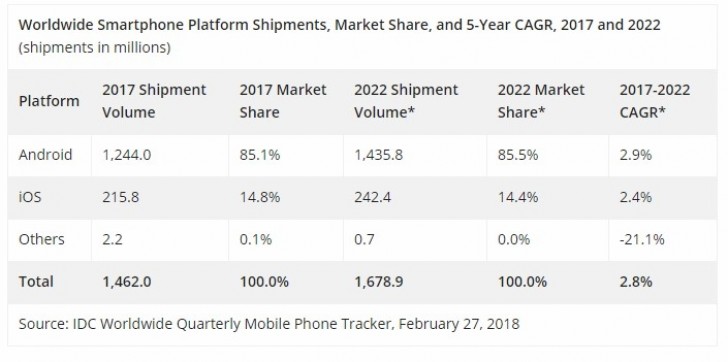 IDC published its yearly analysis of the smartphone shipments market. According to the company, manufacturers pushed 0.5% fewer devices in 2017, compared with 2016, or a total of 1.46 billion smartphones, almost all of them running either Android or iOS.
